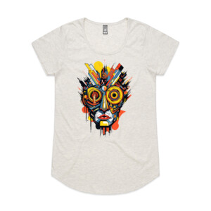 The "Misunderstood" tee features a strikingly detailed illustration of a robot's face. The design conveys a sense of depth and emotion, unusual for a robotic figure, with a melancholic expression that speaks volumes about feeling out of place or misunderstood. The robot's face, while inherently mechanical, is adorned with a spectrum of bright, lively colors, contrasting its sorrowful demeanor and symbolizing the complexity of emotions hidden beneath the surface.